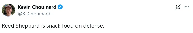 比賽中,鷹記老鷹記者Kevin Chouinard更推,推里評價了火箭后衛(wèi)里德-謝潑德的防守表現(xiàn),他寫道: