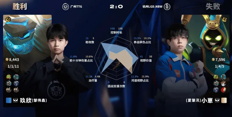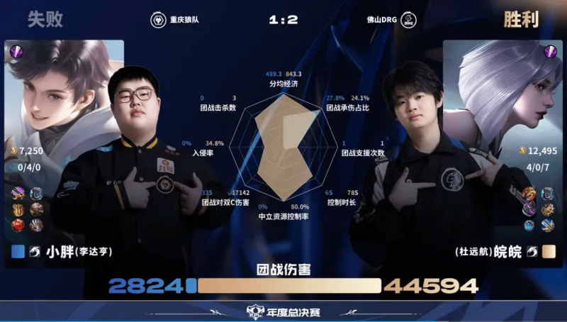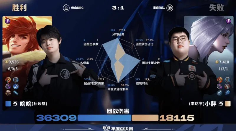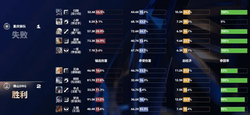 對陣佛山DRG的第三局,元坦4.1%的輸出占比、23.2%的承傷占比險勝一笙魯大。明明沒抗多少傷害,但卻死出個0-4-0的戰(zhàn)績。