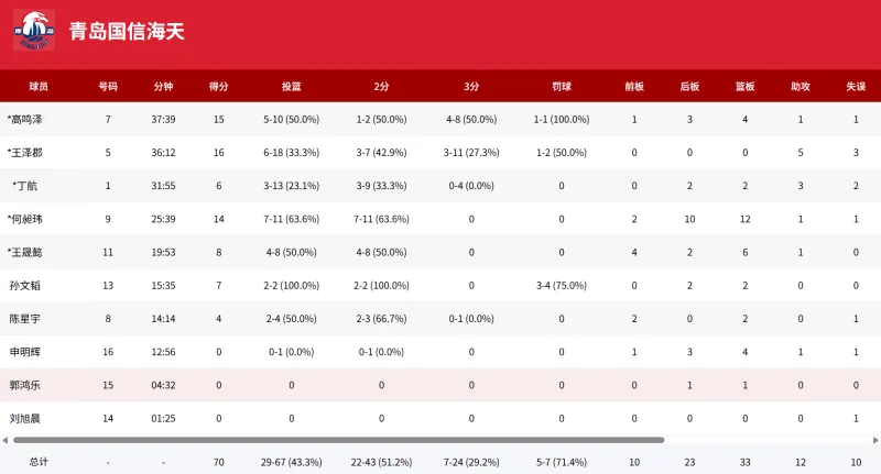 青島U17男籃:王澤郡16分、澤郡高鳴澤15分、分青何昶瑋14分12籃板