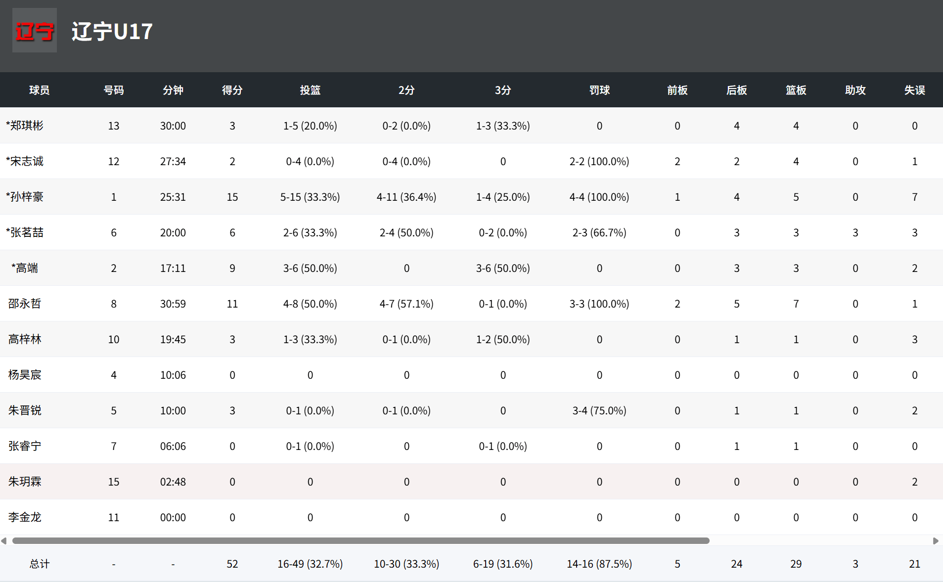 遼寧U17男籃:孫梓豪15分、男籃邵永哲11分、全國(guó)高端9分