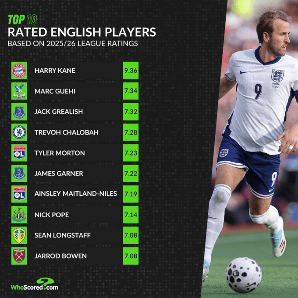 虎撲10月03日訊 Whoscored統(tǒng)計(jì)了英格蘭球員本賽季在各大聯(lián)賽的表現(xiàn)評(píng)分,詳情如下: