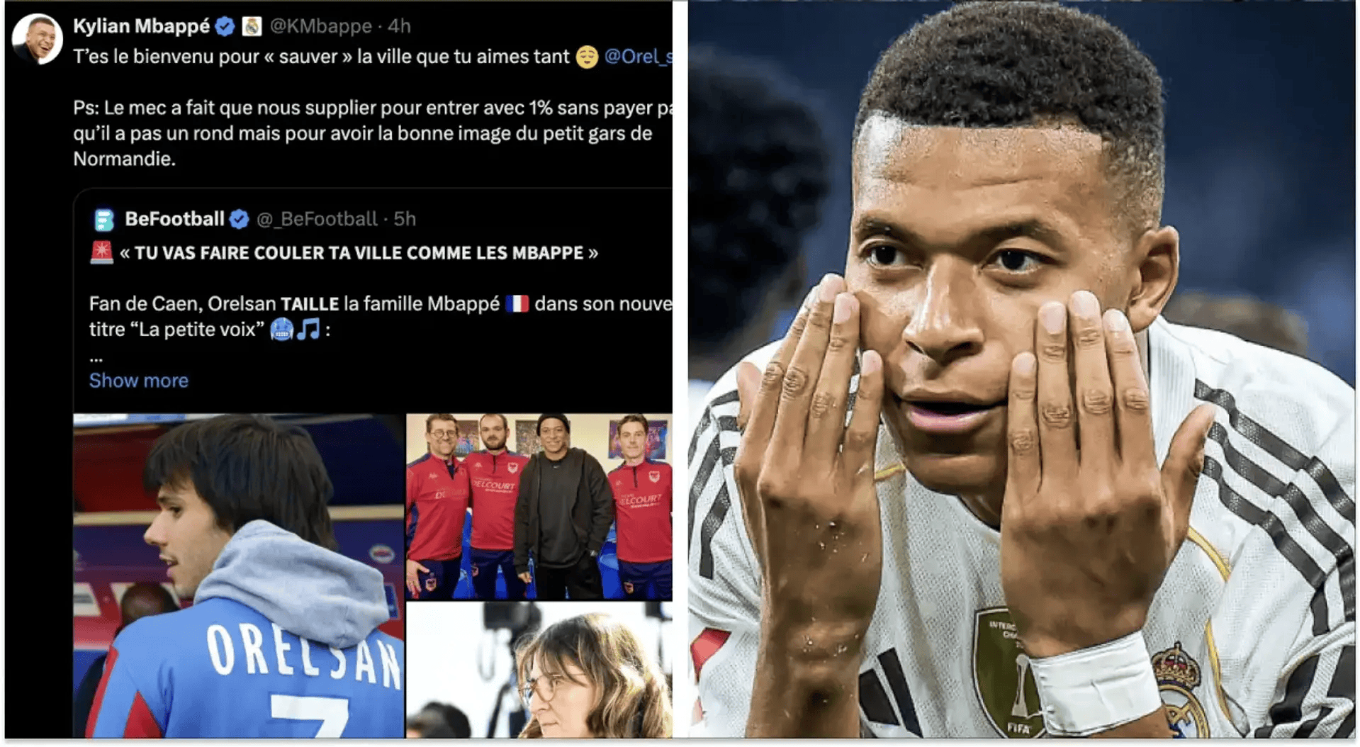虎撲11月08日訊 近日,法國足球巨星姆巴佩與著名說唱歌手奧雷爾桑之間因一首歌發(fā)生了公開沖突。在奧雷爾桑的最新歌曲《La Petite Voix》中,他唱到:“你們將像姆巴佩一樣沉沒你們的城市。”這句歌詞顯然是對姆巴佩家族收購的卡昂足球俱樂部進行諷刺,因該俱樂部在上賽季降級到法國第三聯(lián)賽,并且面臨嚴峻的財務困境。