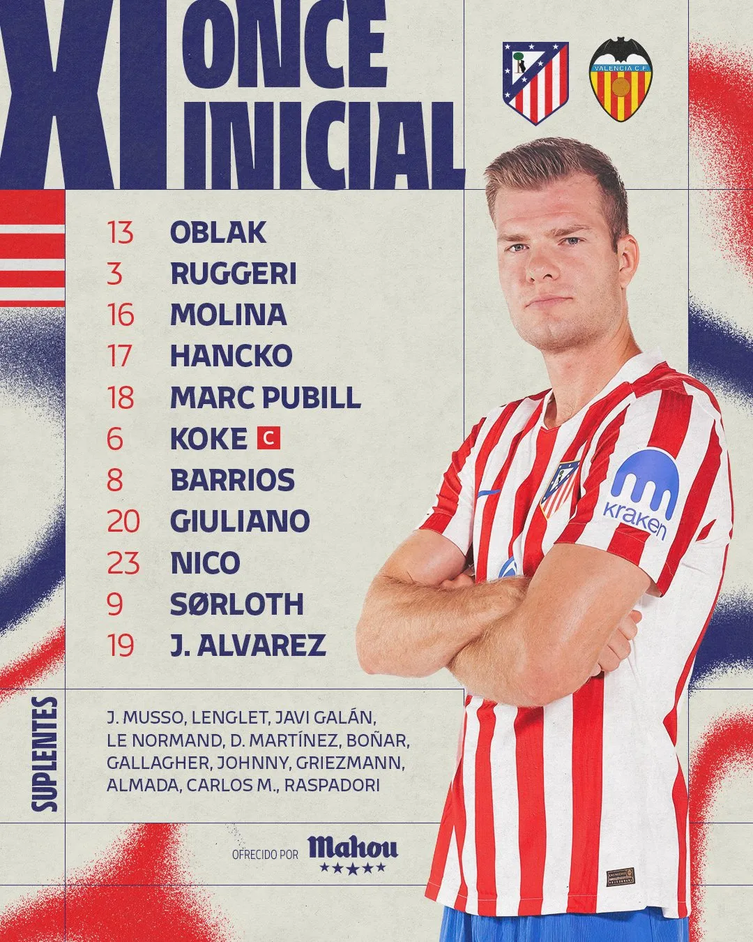 虎撲12月13日訊 北京時間12月13日晚21時,2025-26西甲聯(lián)賽第16輪,馬德里競技和瓦倫西亞在大都會球場展開對決。賽前雙方公布了首發(fā)名單。