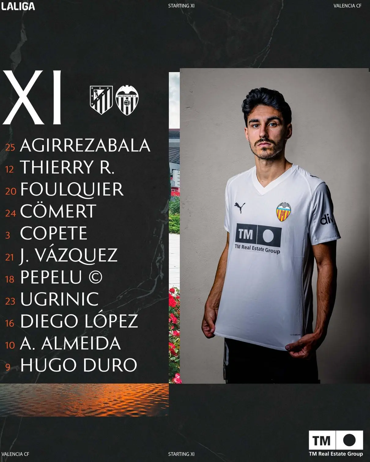 瓦倫西亞首發(fā):25-阿吉雷薩瓦拉/20-富爾基耶、24-科莫特、3-科佩特、21-赫蘇斯-巴斯克斯/23-烏戈里尼奇、18-佩佩盧、12-蒂耶里-科雷亞、10-阿爾梅達、16-迭戈-洛佩斯/9-烏戈-杜羅