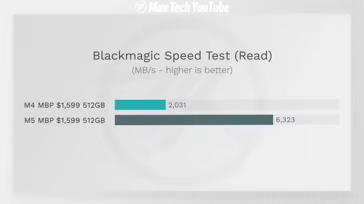虎撲10月26日訊 新款 MacBook Pro 在外形設(shè)計(jì)上并無明顯變化,這或許會(huì)讓人認(rèn)為蘋果只是簡(jiǎn)單地為其搭載了全新的 M5 芯片便草草了事。然而事實(shí)上,這款便攜式 Mac 電腦在內(nèi)部進(jìn)行了大量升級(jí),其中最引人注目的是顯著提速的固態(tài)硬盤(SSD)。最新對(duì)比測(cè)試顯示,與 M4 版 MacBook Pro 相比,M5 機(jī)型的 SSD 讀寫速度最高提升了 211%。