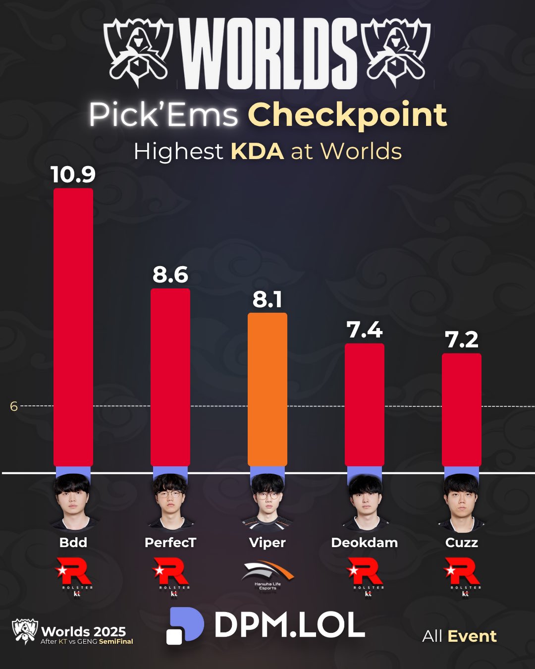 虎撲11月02日訊 昨日KT戰(zhàn)勝GEN挺進(jìn)決賽,賽后外媒統(tǒng)計(jì)S15KDA排名,總決具體如下: