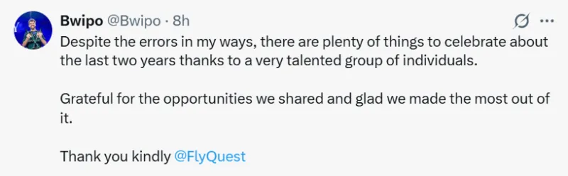 虎撲12月11日訊 今日FLY宣布上單Bwipo離隊(duì),Bwipo轉(zhuǎn)評(píng)離隊(duì)公告,公告具體如下: