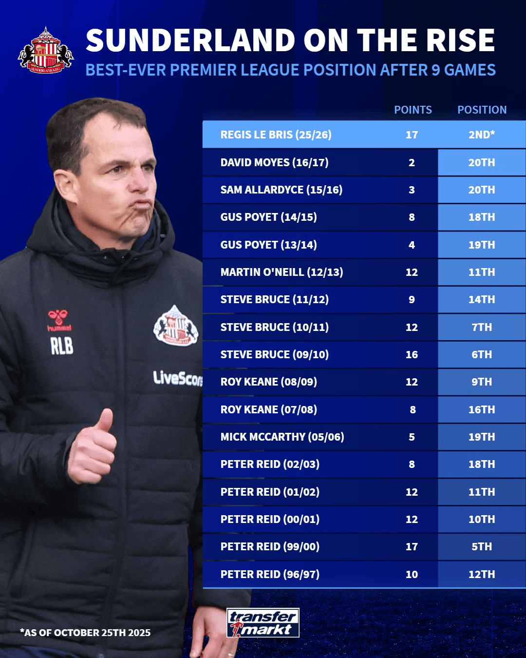 本賽季和彼得-里德治下的1999-00賽季一樣,在前9輪拿到17分,這是桑德蘭隊(duì)史前9輪后英超的最高積分;與此同時(shí),本季目前排在的第2名也是桑德蘭隊(duì)史前9輪后的最高排名。