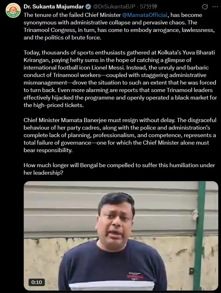 “今天,成千上萬的體育愛好者聚集在加爾各答的鹽湖體育場(chǎng),他們花高價(jià)只為一睹世界足壇巨星梅西的風(fēng)采。然而,TMC黨(全印度草根大會(huì))的工作人員卻表現(xiàn)得極其無序和野蠻,再加上行政極度失職,最終把局面推到了極端,導(dǎo)致梅西被迫取消行程。據(jù)報(bào)道,一些該黨領(lǐng)導(dǎo)人甚至劫持了整個(gè)活動(dòng),并公然將高價(jià)門票倒賣,這更令人震驚。”