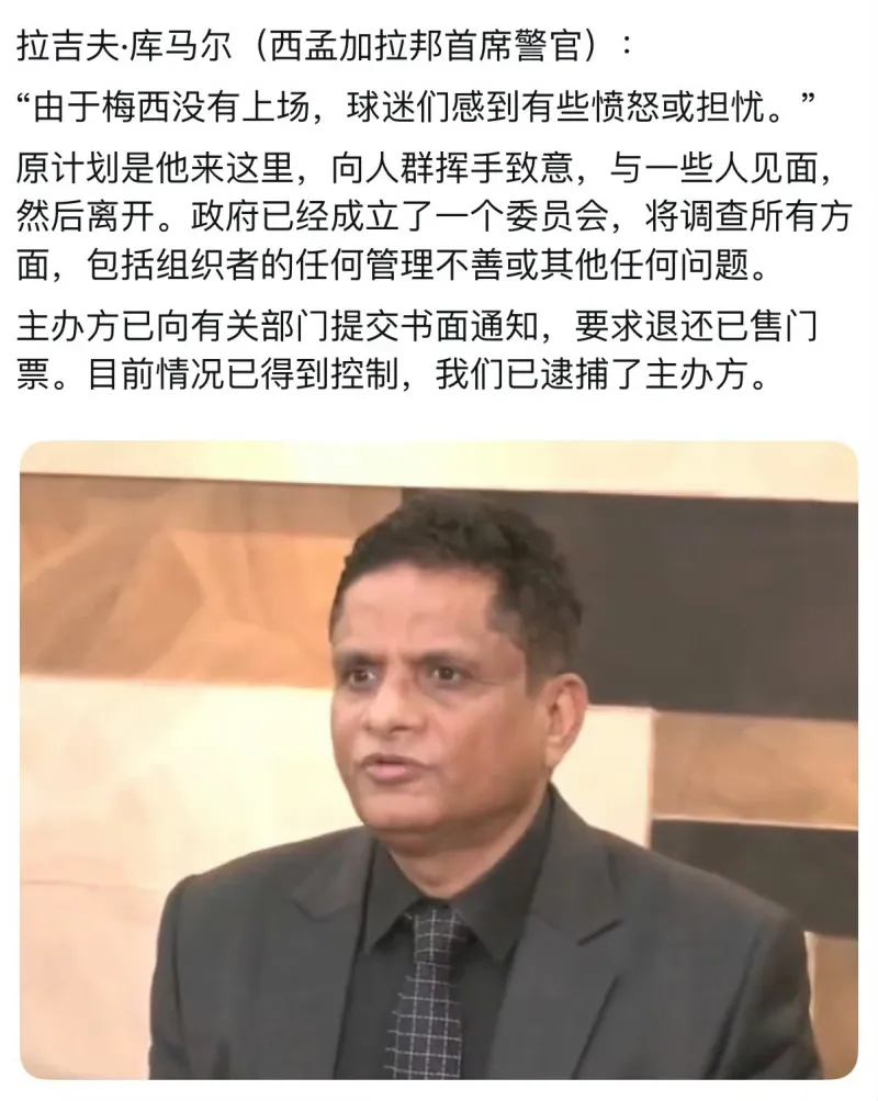 孟加拉邦首席警官也表示,已逮捕該活動(dòng)主辦方,將就組織不力向主辦方追責(zé),并得到主辦書面保證向現(xiàn)場(chǎng)球迷退票。
