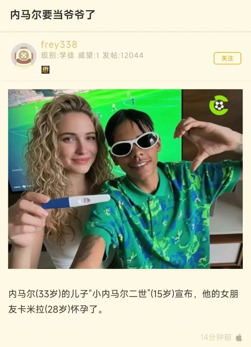33歲的內(nèi)馬爾的15歲兒子的28歲女友宣布懷孕?