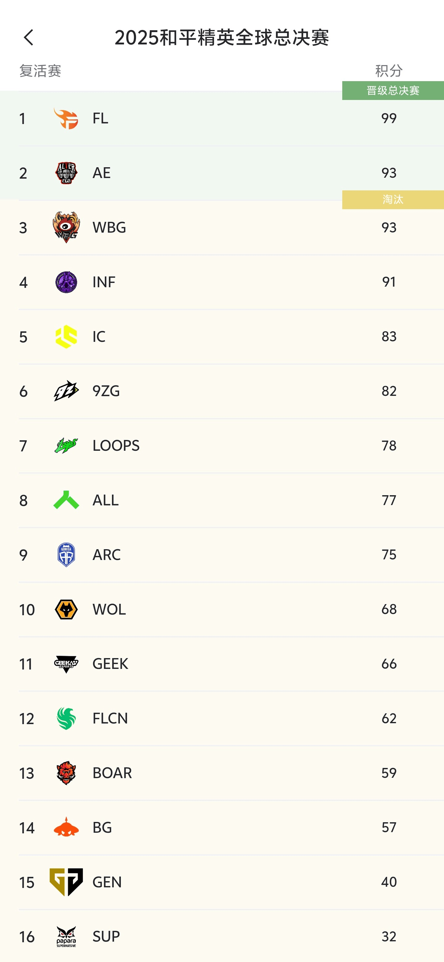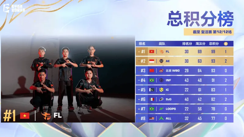 虎撲12月08日訊 12月7日積分榜:2025和平精英全球總決賽復(fù)活賽第2比賽日,F(xiàn)L積99分榜一晉級(jí),分榜分晉而由于WBG吃雞數(shù)為0,積分級(jí)A借兩雞同級(jí)故在同分情況下排名低于AE,次吃無(wú)緣總決賽。板月榜晉具體積分如下: