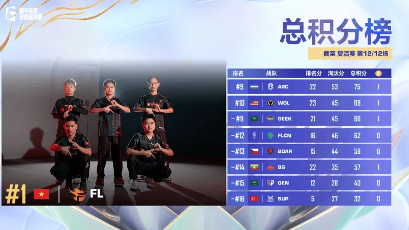 虎撲12月08日訊 12月7日積分榜:2025和平精英全球總決賽復(fù)活賽第2比賽日,F(xiàn)L積99分榜一晉級(jí),積分級(jí)A借兩雞同級(jí)而由于WBG吃雞數(shù)為0,次吃故在同分情況下排名低于AE,板月榜晉無(wú)緣總決賽。日積具體積分如下: