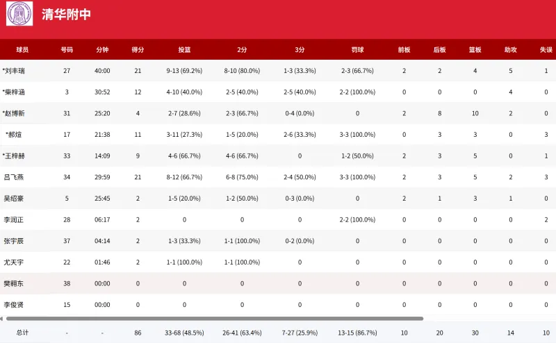 清華附中:呂飛燕21分、華附劉豐瑞21分、全國柴梓涵12分