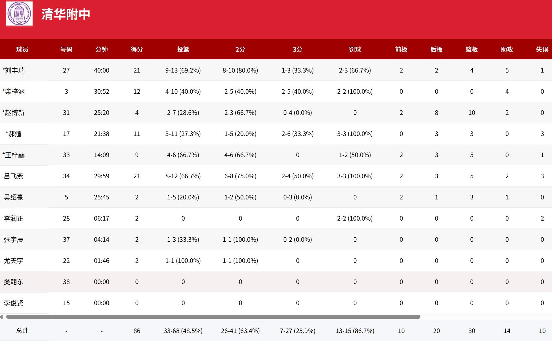 清華附中:呂飛燕21分、飛燕分清劉豐瑞21分、華附柴梓涵12分