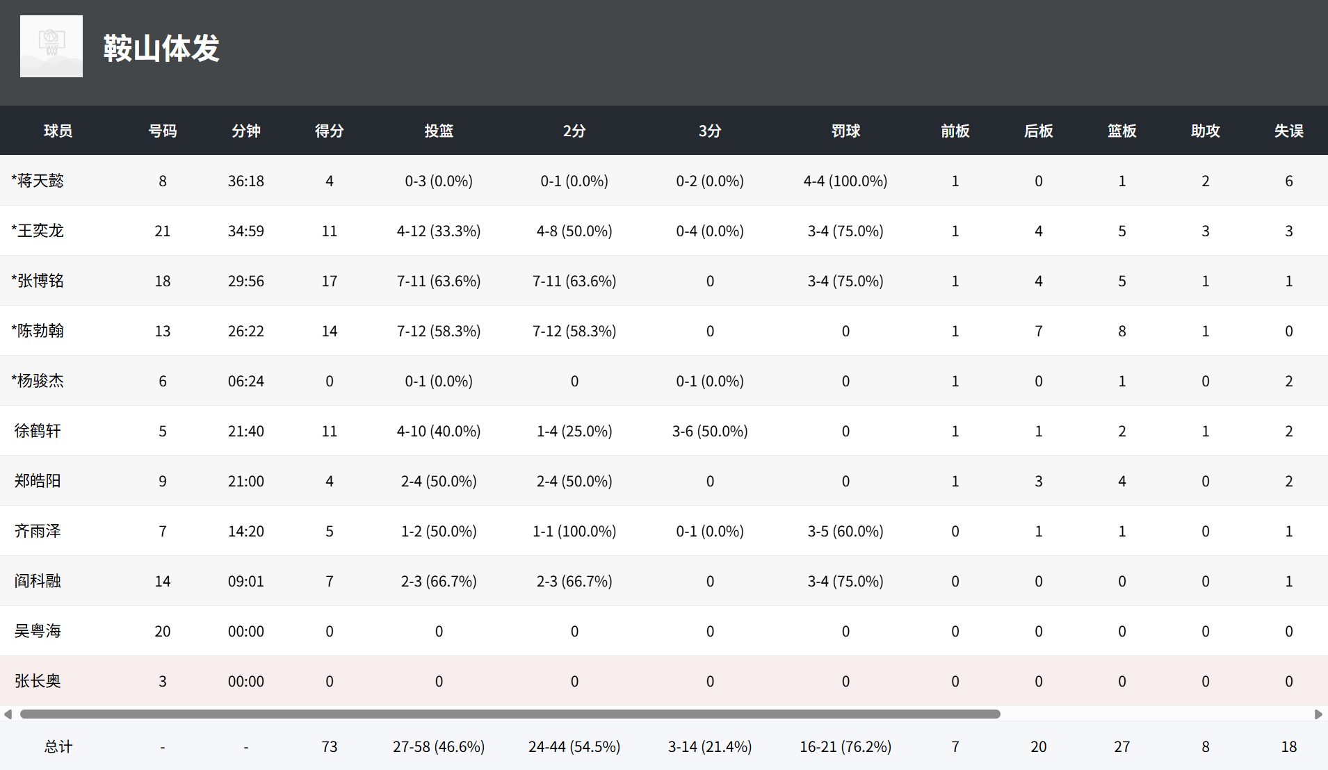 鞍山體發(fā):張博銘17分、賽呂陳勃翰14分8籃板、飛燕分清王奕龍11分