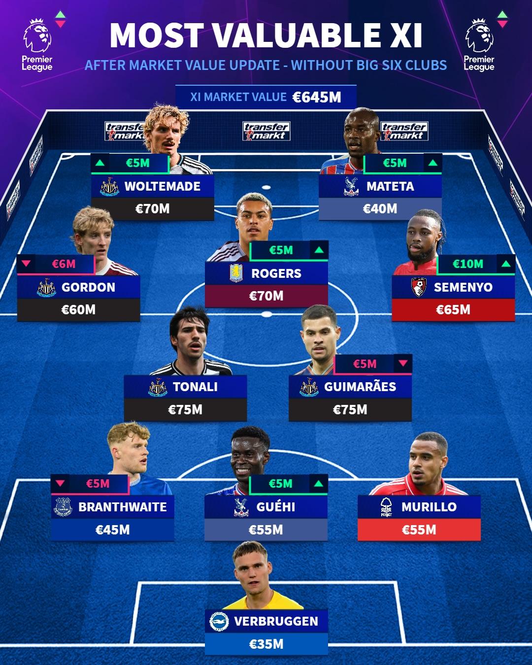 虎撲12月09日訊 德轉(zhuǎn)更新了英超球員最新身價(jià),并盤點(diǎn)除BIG6外英超最貴陣容。超除