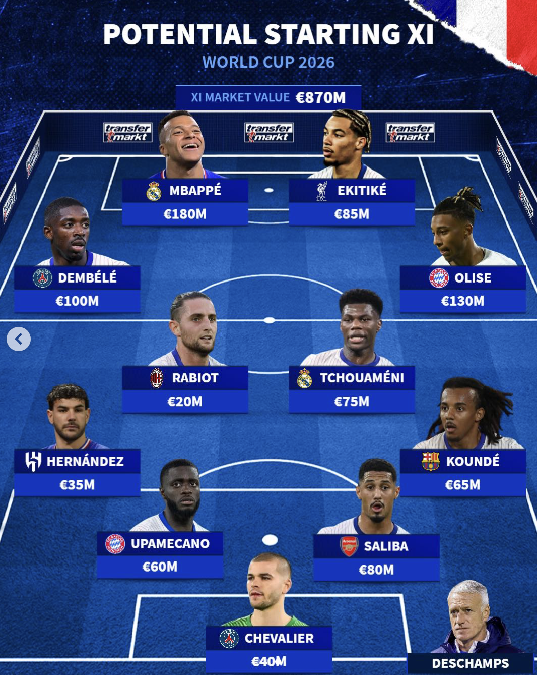虎撲12月07日訊 德轉(zhuǎn)公布了法國在2026年世界杯的預(yù)計(jì)首發(fā)十一人。陣容總身價(jià)為8.7億歐,國世其中前鋒姆巴佩以1.8億歐的界杯身價(jià)為全隊(duì)最高。