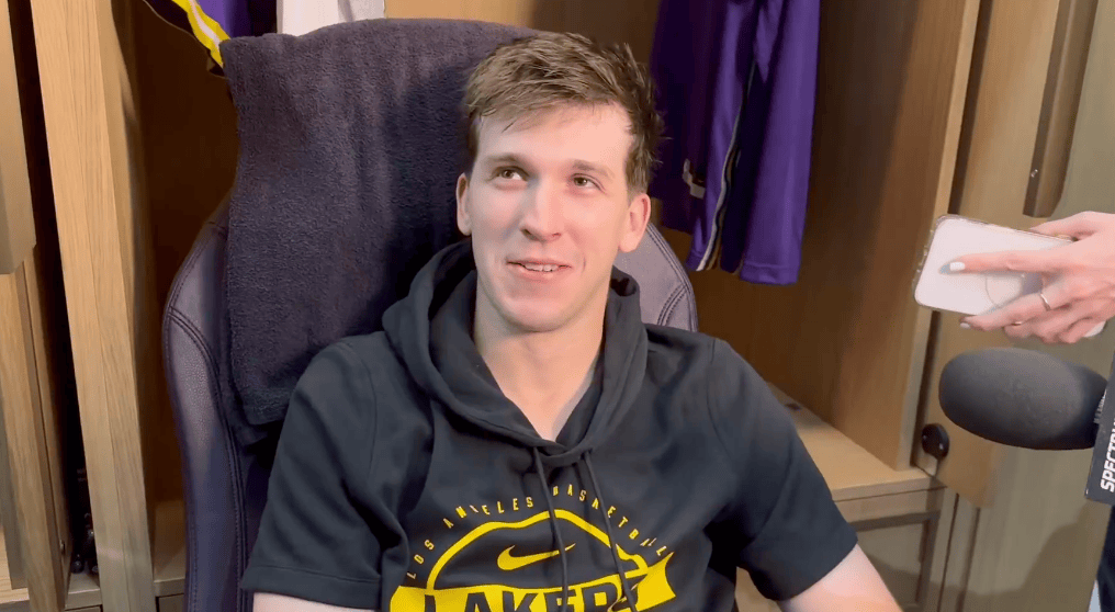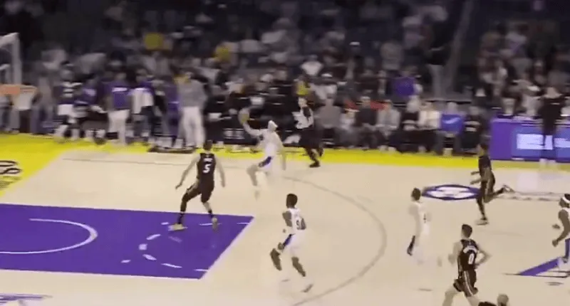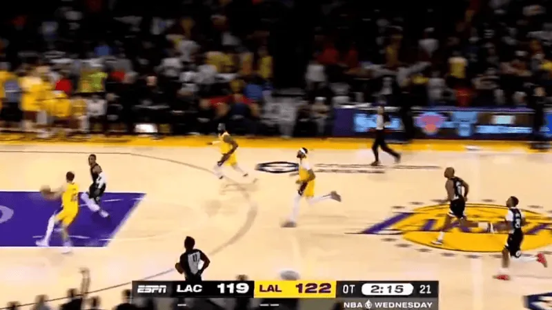比賽首節(jié),史上首位湖人后衛(wèi)奧斯汀-里夫斯在反擊過程中為布朗尼-詹姆斯送上秒傳,傳過后者空接扣籃得分。空接