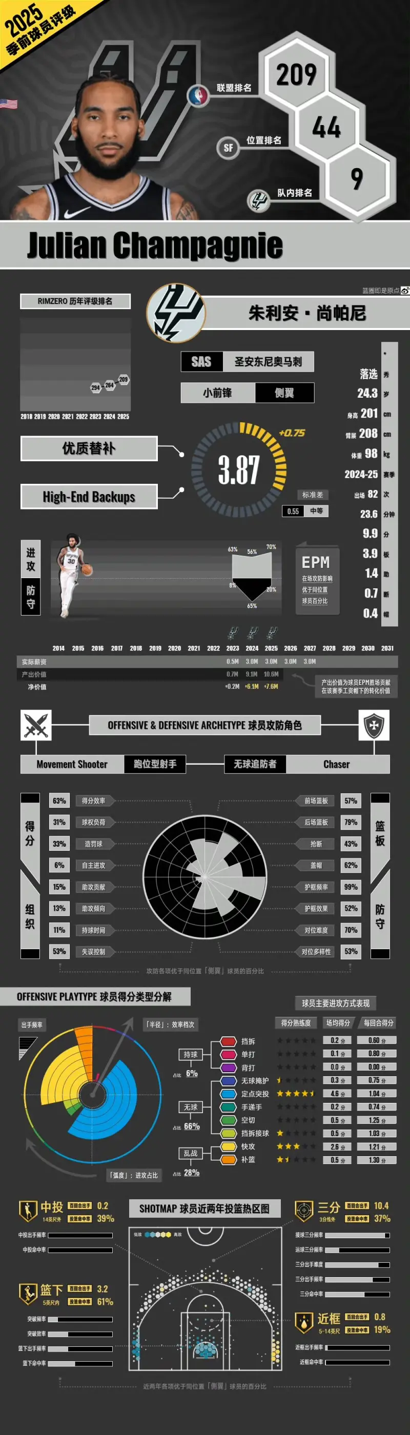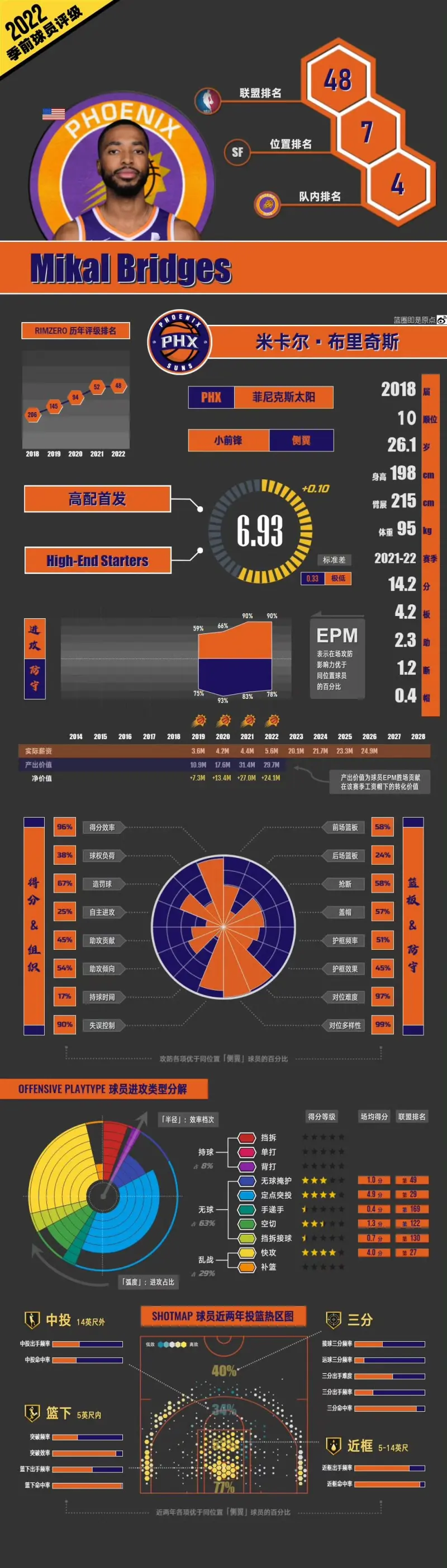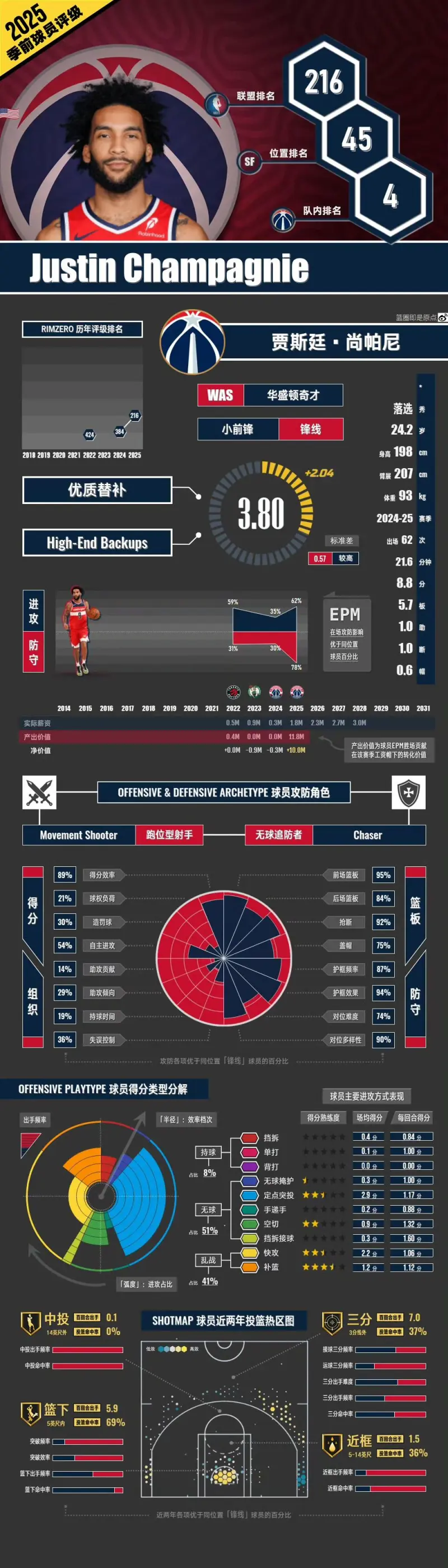 參考2122太陽(yáng),湖人首發(fā)三號(hào)位的要求是,要有基本的2-4號(hào)位領(lǐng)防能力;要有一定的護(hù)框能力和協(xié)防能力,彌補(bǔ)艾頓的不足。且不能太拖進(jìn)攻(湖人本質(zhì)是立足進(jìn)攻的球隊(duì))。參照2022大橋,我找出了一位在防守?cái)?shù)據(jù)上匹敵大橋的,奇才的前雷管出身發(fā)掘的尚帕尼。此人是馬刺尚帕尼的弟弟,從球風(fēng)到長(zhǎng)相都極其類似,水平目測(cè)相差不多,綜合能力高于克里斯蒂。重要的是他現(xiàn)在領(lǐng)著230萬(wàn)轉(zhuǎn)正雙向的底薪合同,且在一只沒(méi)有文班的擺爛球隊(duì)打出的防守?cái)?shù)據(jù)更有說(shuō)服力。交易來(lái)后波普+尚帕尼+斯瑪特基本兼防各種類型123號(hào)位,看策略使用。