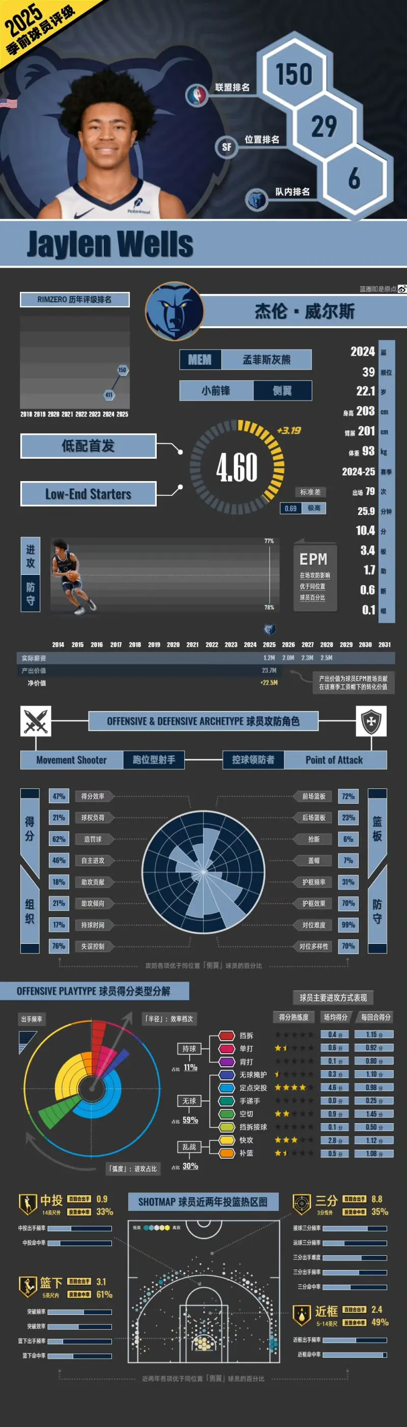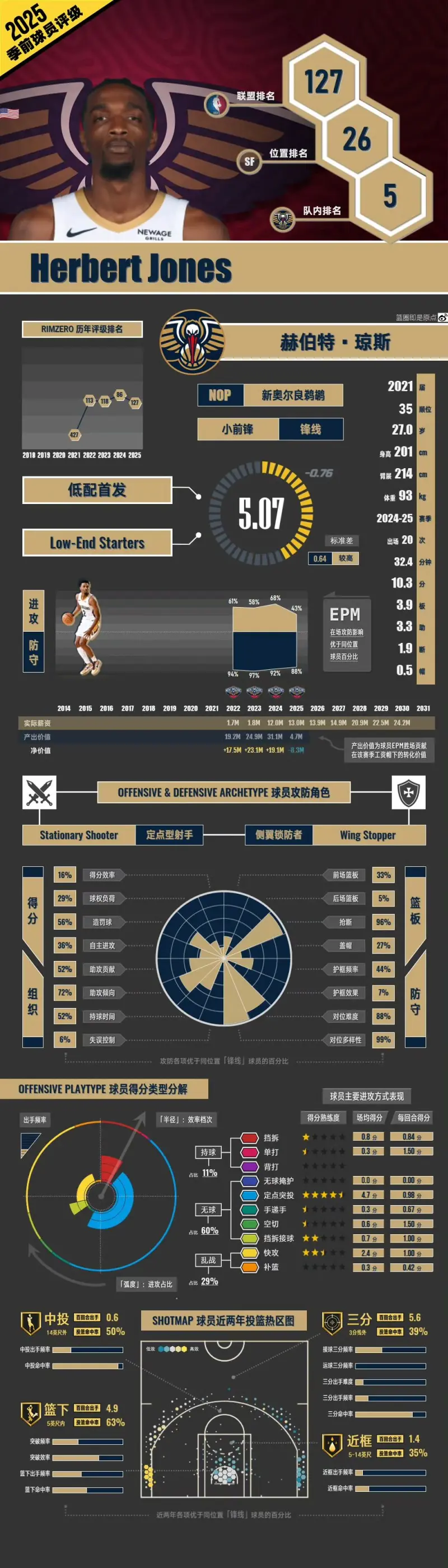 至于赫伯特瓊斯,此人攻防不均衡,多年三分拒投近框終結(jié)極差,且證實(shí)打不了小球中鋒。傳控能力差,護(hù)框能力一般,進(jìn)攻基本副貢獻(xiàn)。參考防守depm高于文班,兼?zhèn)鋫骺氐捻敿?jí)3D卡魯索續(xù)約合同也就2000萬(wàn),此人的實(shí)力更接近于快船小德里克瓊斯。我認(rèn)為鵜鶘給他的28年起步的2000萬(wàn)是溢價(jià)合同。此人真實(shí)價(jià)值應(yīng)在1500萬(wàn)左右