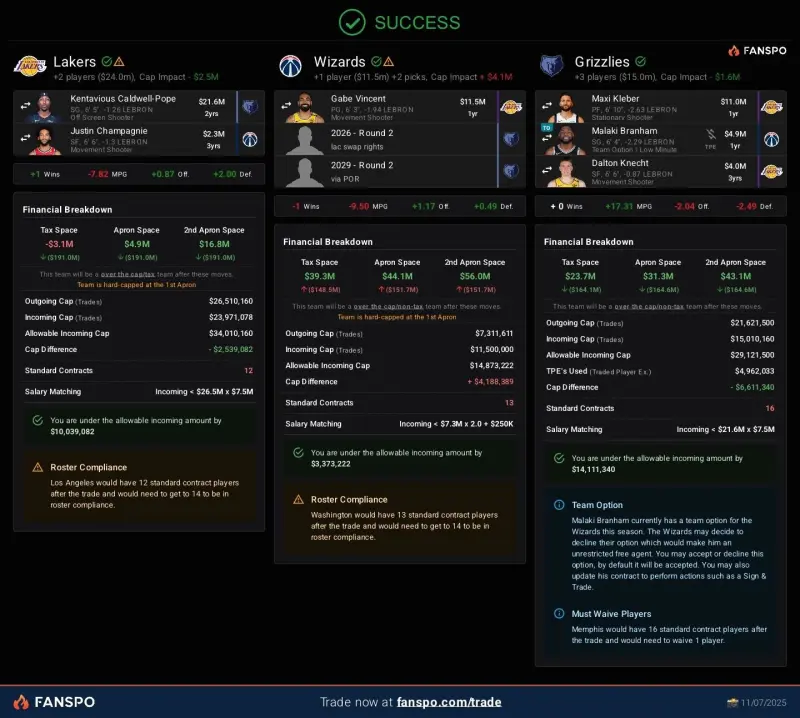 與灰熊,奇才兩個(gè)老朋友三方交易。灰熊得到克勒貝爾擺爛和田納西大學(xué)名宿克內(nèi)克特賣票,省了波普明年2000多萬(wàn)工資,減少虧損;奇才得到灰熊的兩個(gè)次輪和熱火詐騙犯文森特,湖人得到波普+尚帕尼。剩下薪金可以看看買斷市場(chǎng)有沒(méi)有射手(我喜歡加里森馬修斯)和替補(bǔ)中鋒。