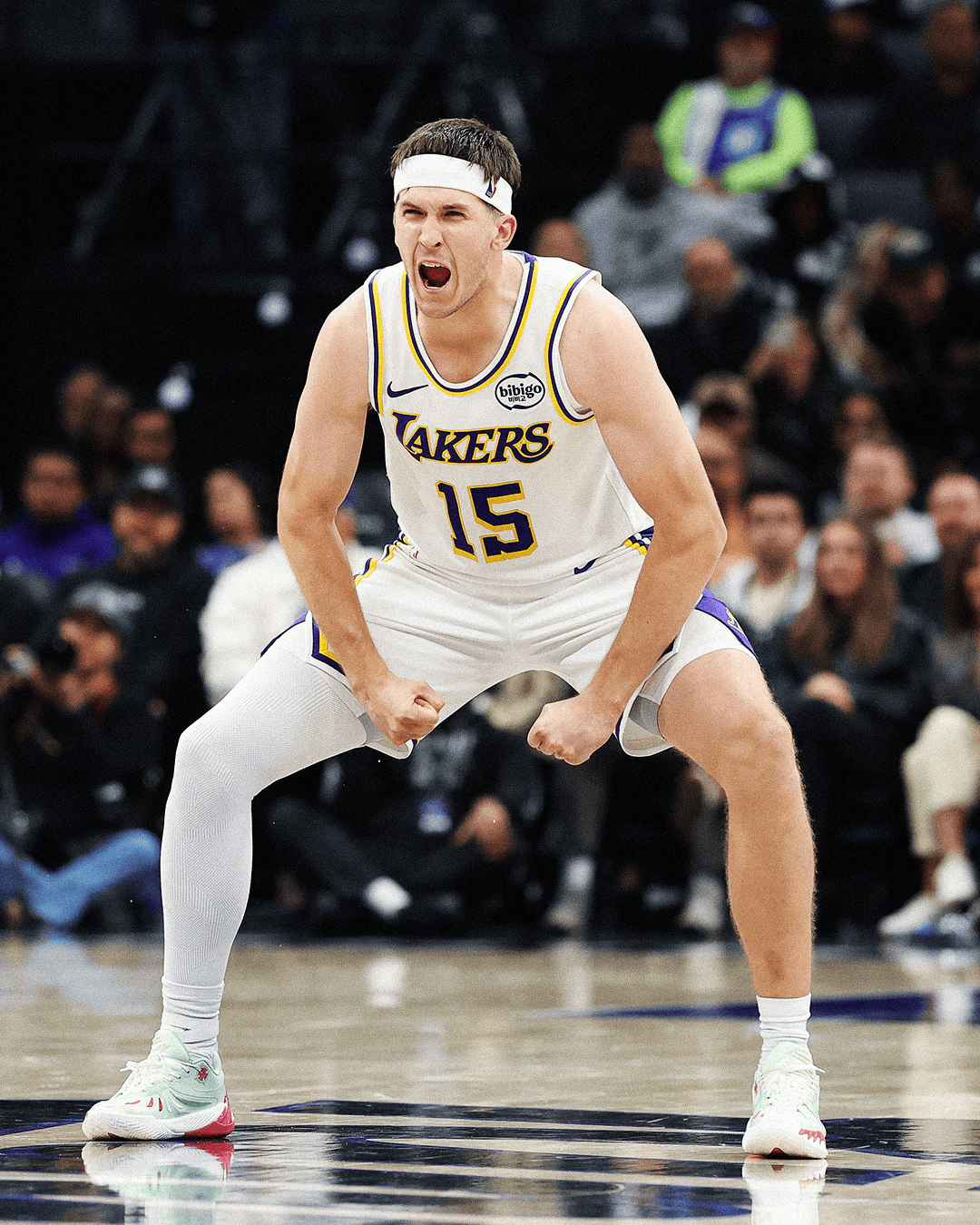 湖人隊記Dan Woike社媒分享湖人球員里夫斯賽場照,記社并寫道:這張照片是媒曬他對德安德烈-艾頓補籃的反應(yīng)。