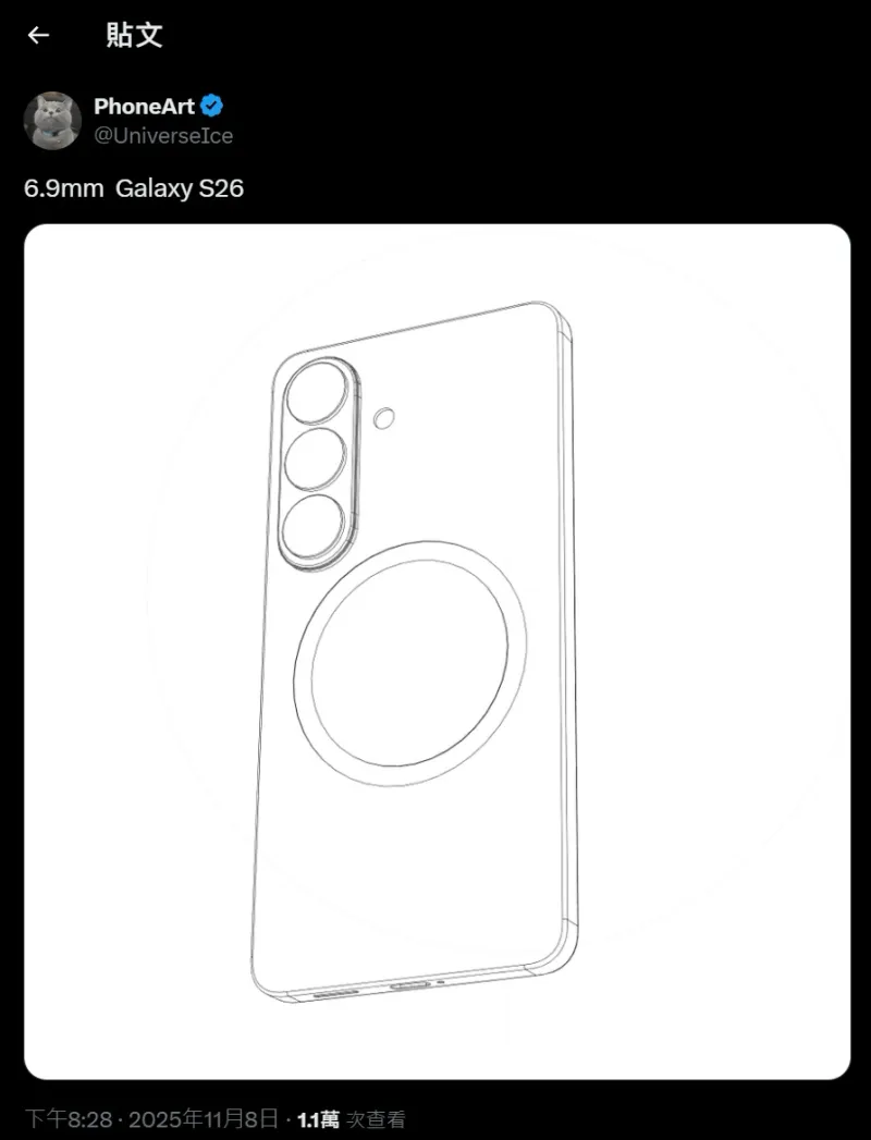 虎撲11月09日訊 消息人士 UniverseIce 今天在 X 平臺(tái)發(fā)文,曝光三星 Galaxy S26 標(biāo)準(zhǔn)版手機(jī)的線稿。