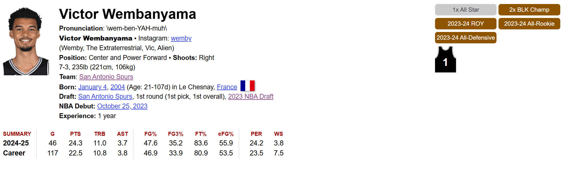 知名數(shù)據(jù)網(wǎng)站Basketball-Reference的蓋帽文班亞馬資料頁(yè)上,也已經(jīng)為文班亞馬添加本賽季蓋帽王的板榮班添榮譽(yù)。