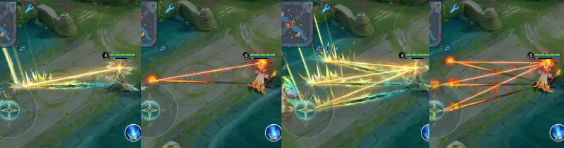 二段攻擊,新皮膚的槍尖上做了破空的特效,有粒子碰撞的碎裂特效,而狗限將云紋的元素利用的很徹底,敵人頭上的印記爆開(kāi),云紋翻飛,而新皮膚表現(xiàn)的更為直接,只是做了一些撞擊的特效,相較于連被動(dòng)的圈都做了特效,這種體現(xiàn)在手感方面的部分反而沒(méi)有做的特別好。
