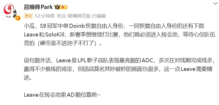 [JR熱議]微博爆料:Doinb、Leave、Solokill都已恢復(fù)自由人身份