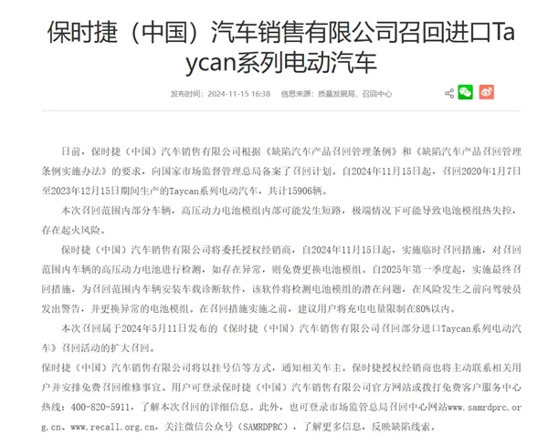 與此同時(shí),保時(shí)捷從2025年第一季度起實(shí)施最終召回措施,為召回范圍內(nèi)的Taycan安裝車載診斷軟件,該軟件將檢測(cè)電池模組的潛在問題,在風(fēng)險(xiǎn)發(fā)生之前向駕駛員發(fā)出警告,并更換異常的電池模組。