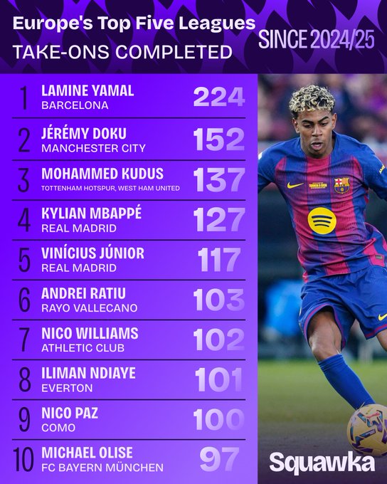 [流言板]224次,亞馬爾是上賽季以來五大聯(lián)賽唯一完成200+過人的球員