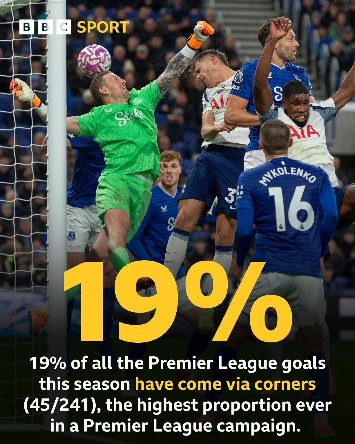 至此本賽季英超共有19%的季本進(jìn)球來自角球(45/241),這是賽季英超歷史上角球進(jìn)球占比最高的一個(gè)賽季。