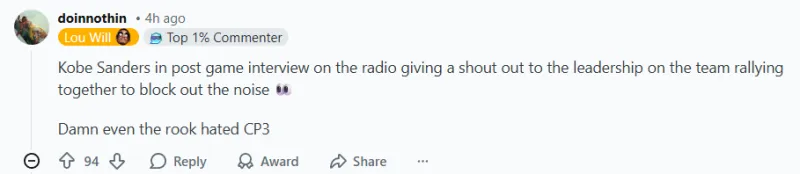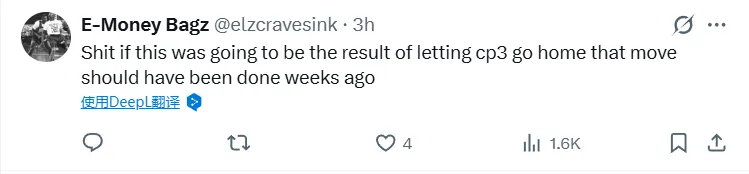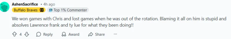 -有克里斯在的時(shí)候,我們贏了比賽,當(dāng)他不在輪換陣容時(shí),我們輸了比賽。把這一切都?xì)w咎于他是愚蠢的,也為勞倫斯-弗蘭克和泰-盧的所作所為開脫了責(zé)任!