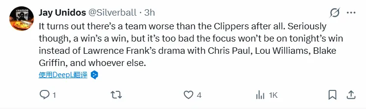 -原來世上還有比快船更爛的球隊(duì)。說真的,贏是贏了,可惜今晚的焦點(diǎn)不會(huì)是這場(chǎng)勝利,而是勞倫斯·弗蘭克和克里斯·保羅、路易斯·威廉姆斯、布雷克·格里芬等人之間的鬧劇。