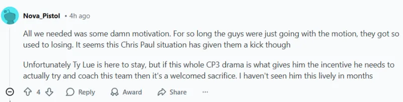 不幸的是,泰倫-盧將繼續(xù)留在這里,但如果整個(gè)保羅事件能給他動(dòng)力,讓他真正嘗試執(zhí)教這支球隊(duì),那么這將是一個(gè)值得歡迎的犧牲。我已經(jīng)好幾個(gè)月沒看到他這么活潑了