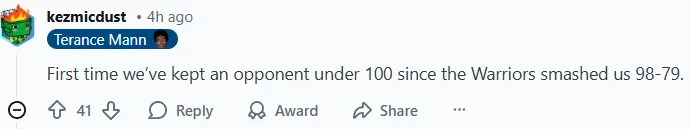-(41贊)自勇士以98-79擊敗我們以來,我們首次將對(duì)手的得分限制在100分以下。