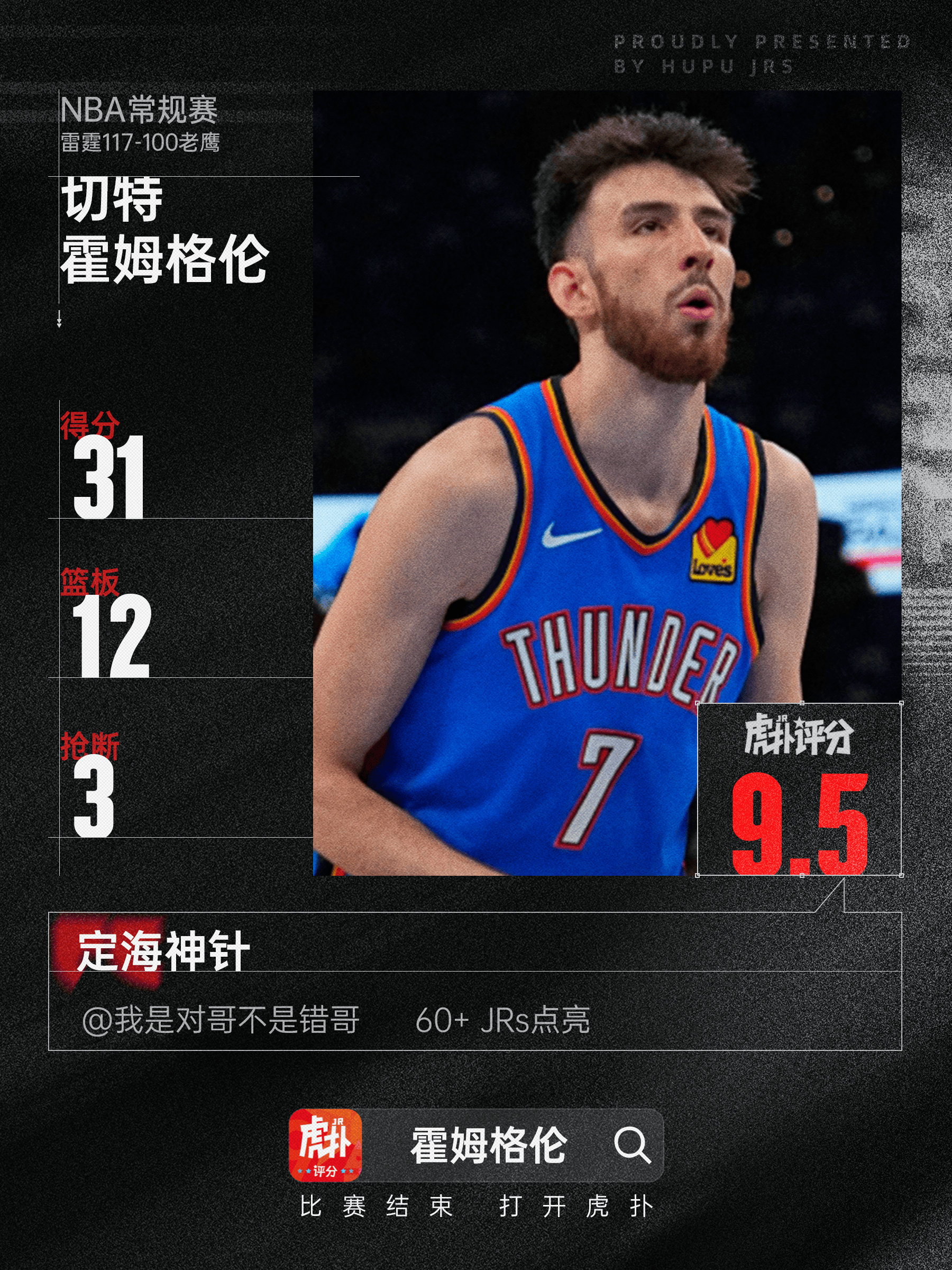 本場(chǎng)比賽,砍下雷霆球員切特-霍姆格倫出戰(zhàn)27分鐘,分籃12投8中,板助其中三分球8投6中,斷封罰球10投9中,狀態(tài)得到31分12籃板1助攻3搶斷1封蓋。火熱霍姆