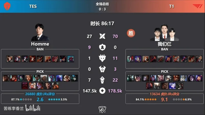 [JR熱議]險(xiǎn)勝!TES輸給T1用時(shí)86分17秒,比T1戰(zhàn)勝WBG的比賽慢了2秒