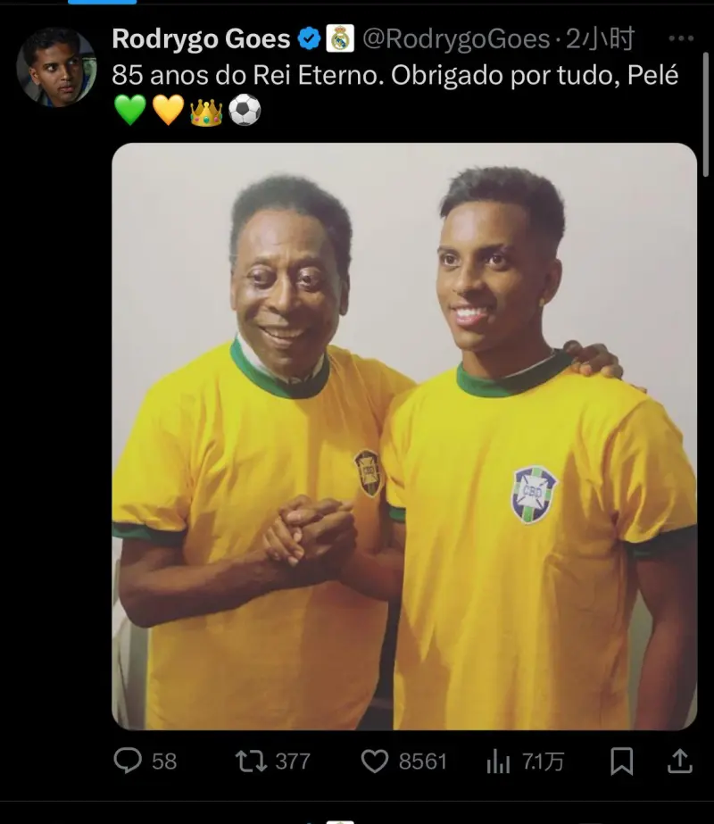 貝利誕辰85周年!貝利皇馬球員羅德里戈寫道:“永恒之王85歲,誕辰