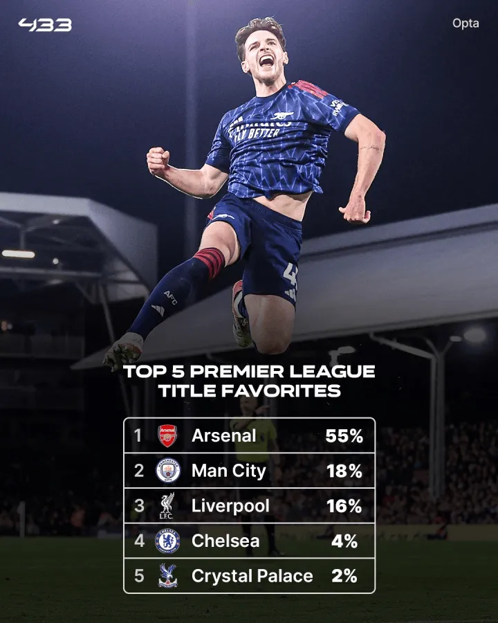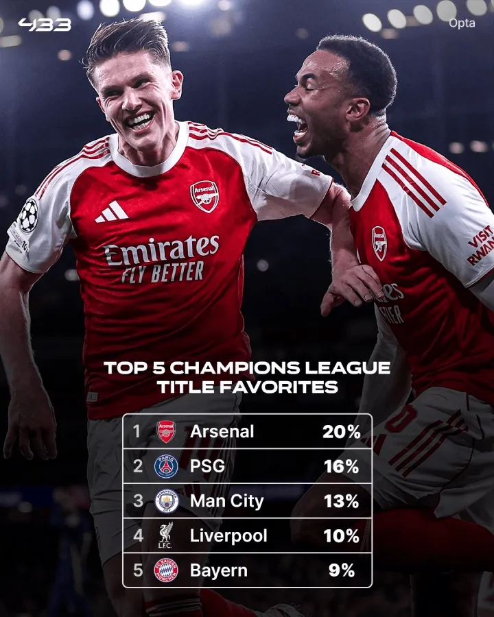 來源:X虎撲10月23日訊 根據(jù)Opta Analyst的統(tǒng)計(jì),阿森納是本賽季最被看好贏得英超聯(lián)賽和歐冠冠軍的球隊(duì)。