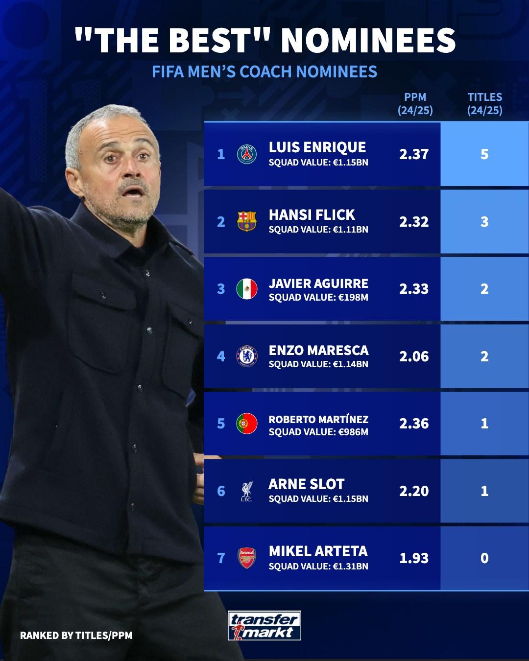 虎撲11月07日訊 德國(guó)轉(zhuǎn)會(huì)市場(chǎng)盤點(diǎn)了FIFA年度最佳教練的候選者,在上個(gè)賽季所取得的恩里成績(jī),詳情如下: