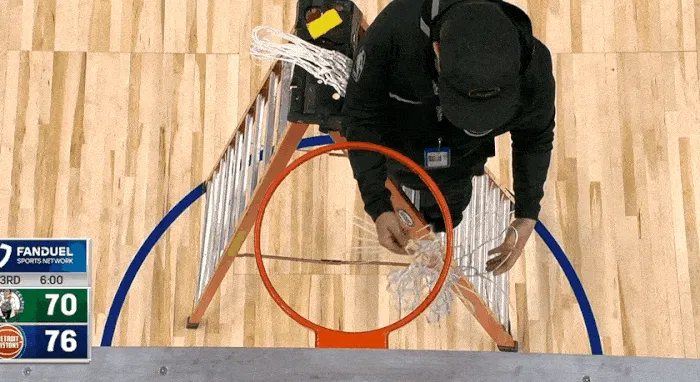 杜倫空接扣籃扯網(wǎng)手指流血下場(chǎng)處理,工作人員緊急更換籃網(wǎng)