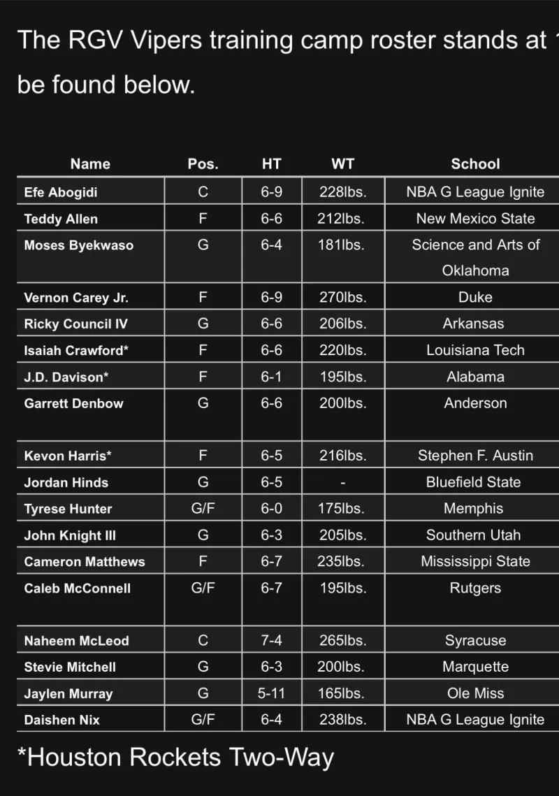 其中,訓練向合火箭的三名雙向合同球員均在列,分別為:JD-戴維森、吉翁-哈里斯與以賽亞-克勞福德。