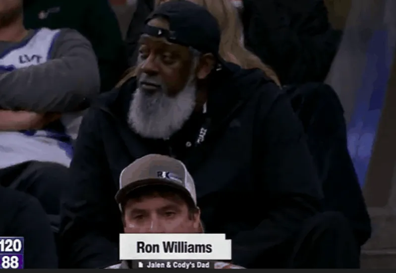 第四節(jié)比賽,再中眾席科迪-威廉姆斯殺入禁區(qū)上籃再中連拿4分,連拿鏡頭給到觀眾席的分鏡父親。