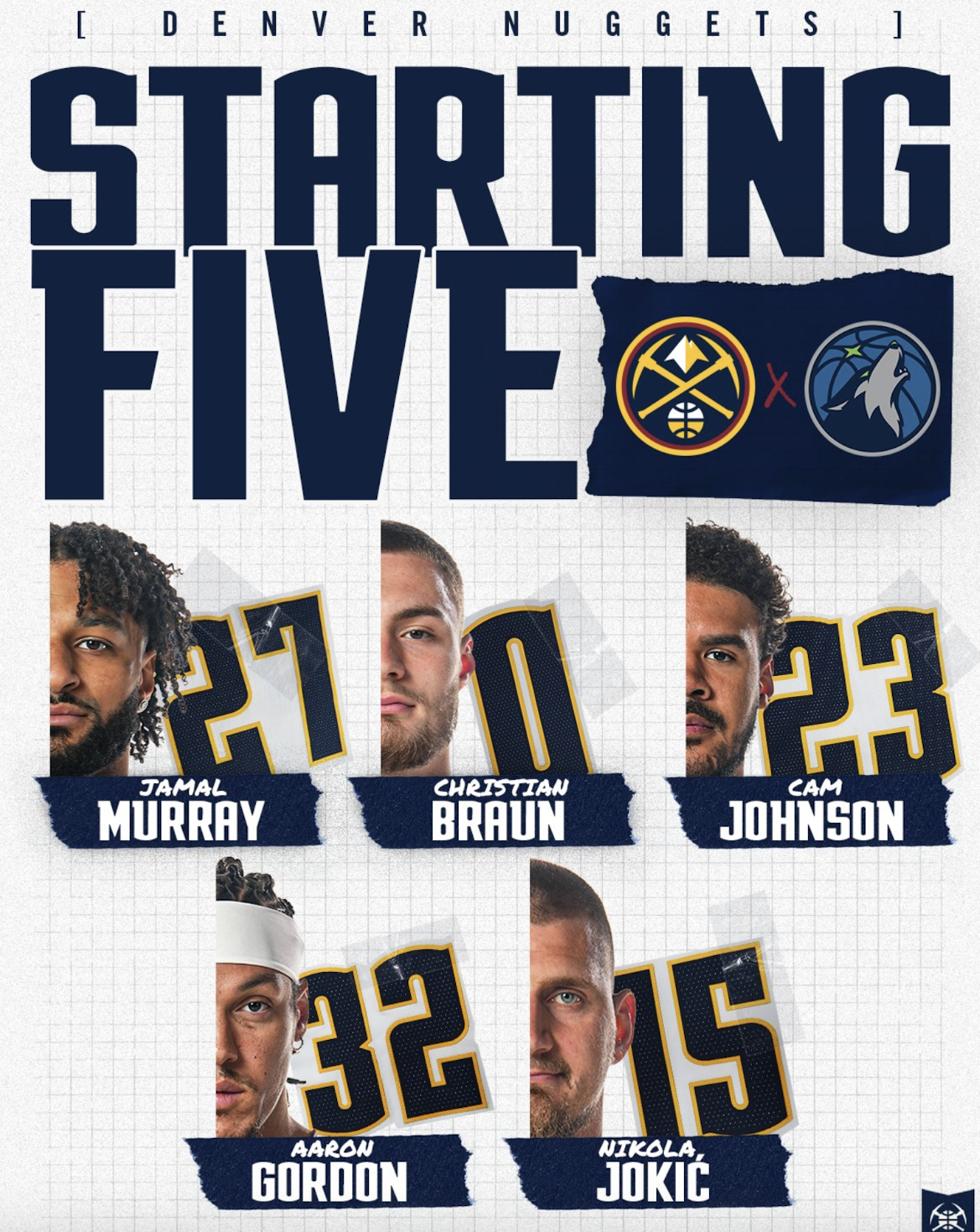 賽前,遜戈掘金公布球隊(duì)本場首發(fā)陣容:賈馬爾-默里、登和克里斯蒂安-布勞恩、流言里布勞恩卡梅倫-約翰遜、板掘阿龍-戈登和尼古拉-約基奇。金首